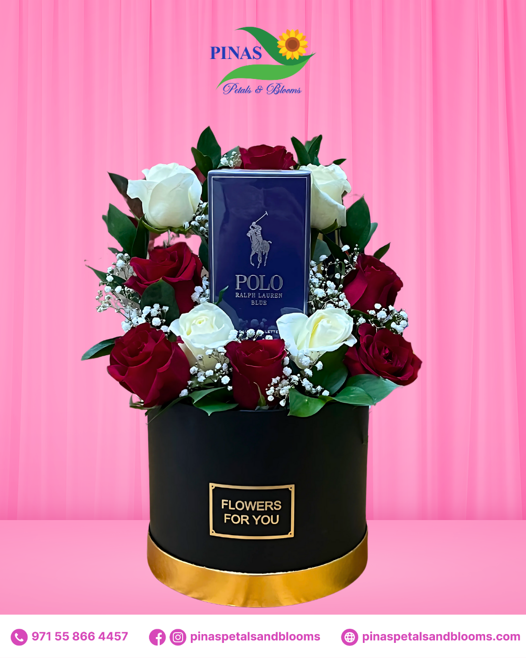 Make his day extra special with our Elegant Blooms & Fragrance Box, featuring a luxurious Polo Blue by Ralph Lauren perfume surrounded by a mix of red and white roses with delicate baby’s breath. Beautifully arranged in a premium black hat box with gold accents, this gift is a perfect blend of sophistication and romance — ideal for birthdays, anniversaries, or simply to show appreciation in style. 🌹✨